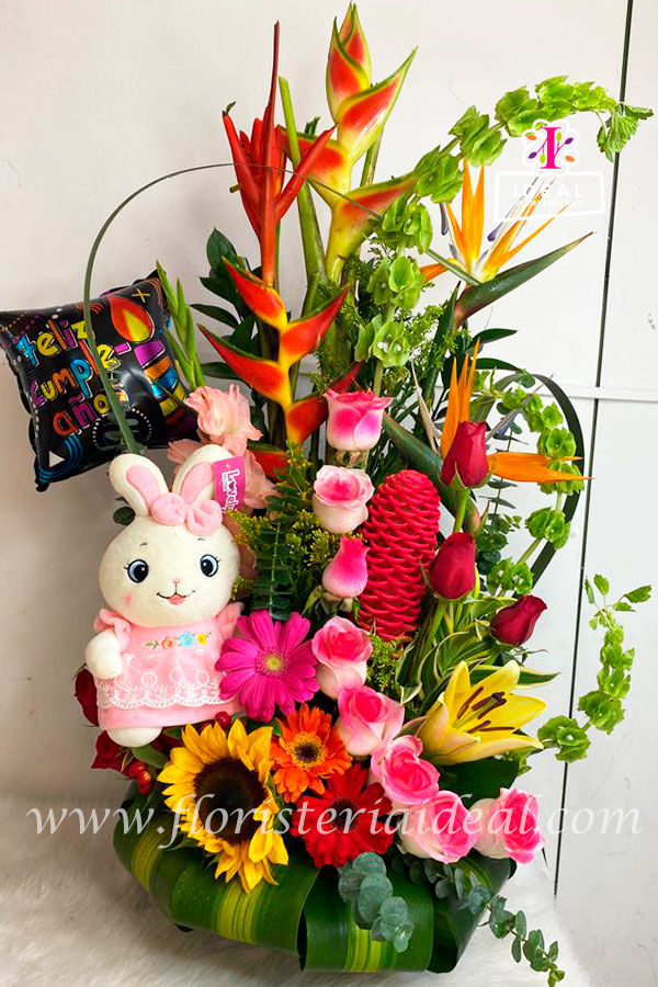 Hermoso ramo floral exótico con lindas rosas, girasoles ,lirio etc. acompañado de tierno peluche , globo metalizado con su respectiva tarjeta y mensaje deseado .