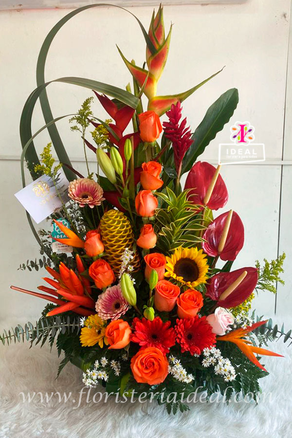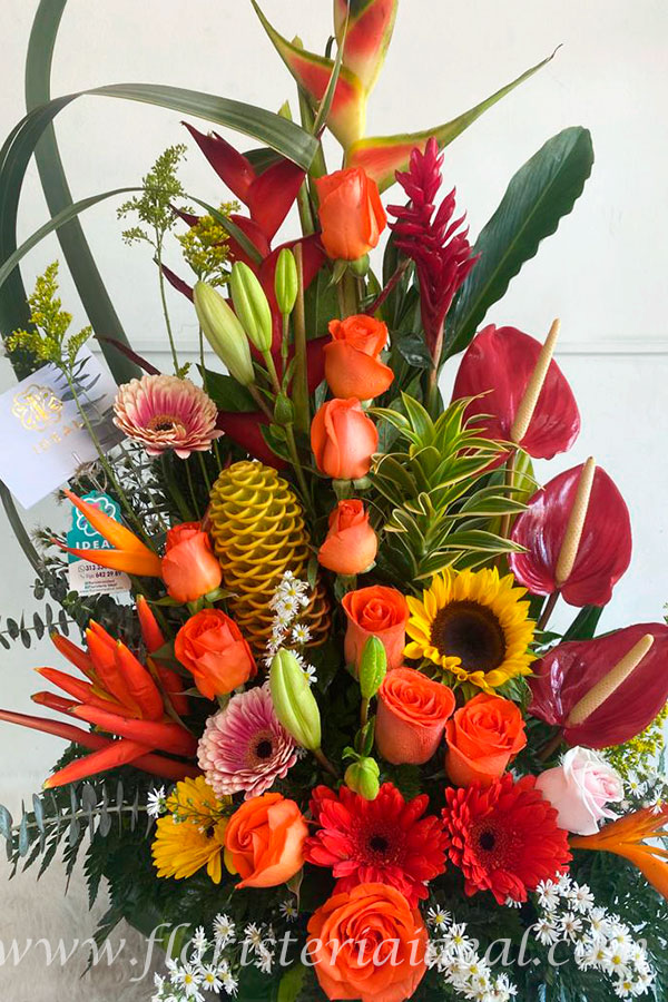 Hermoso arreglo exótico con gran variedad de flores, con tarjeta personalizada para la ocasión