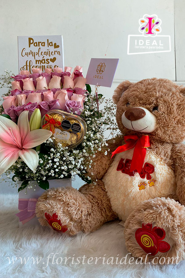 Hermoso arreglo floral elaborado en bella caja de rosas lila y rosada, mas tierno peluche y deliciosos chocolates en forma de corazon, y tarjeta personalizada para la ocasión