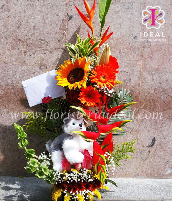 Lindo arreglo floral elaborado con flores surtidas y lindos follajes acompañado de tierno perrito de peluche y tarjeta para la ocasión.