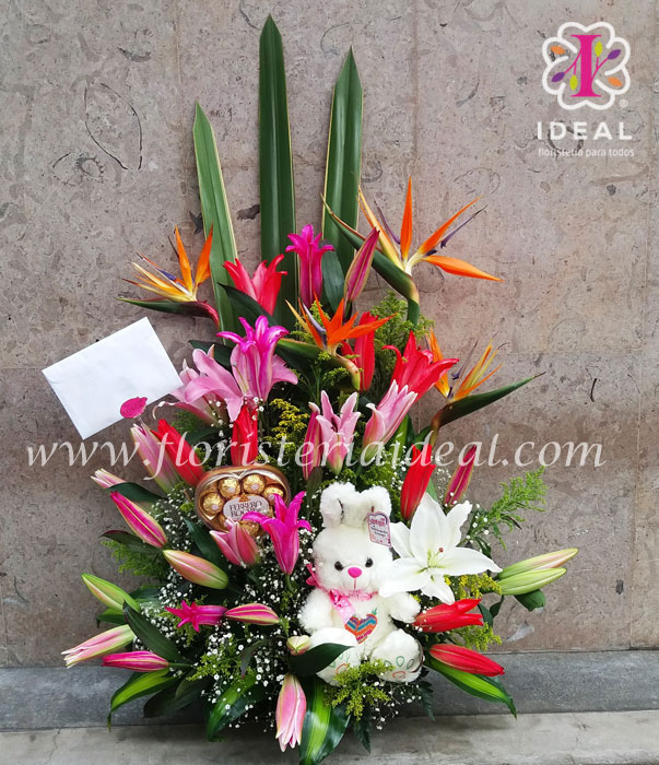 especial y hermoso arreglo floral elaborado con bellos lirios de colores y hermosos follajes acompañado de lindo peluche y ricos chocolates ferreros incluye tierna tarjetica. a computador..