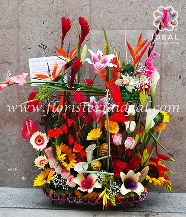 sorprenda a tu hermosa dama con esta bella creasion elaborada con lindas flores exoticas , su forma es una tierna jardinera y esta acompañada de una tarjeta a computador para la ocasion..