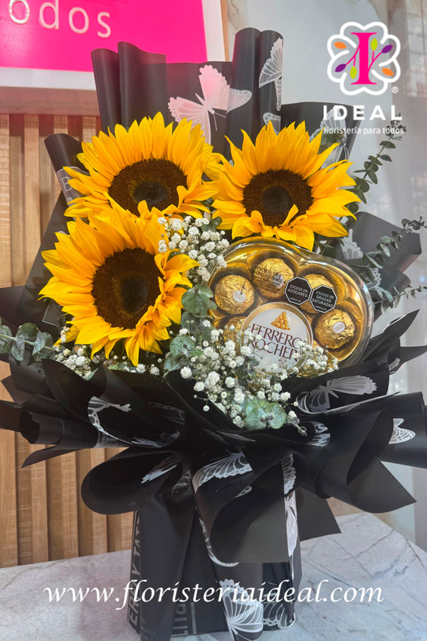 nada mejor que sorprender con el detalle ideal de girasoles acompañado de chocolates
