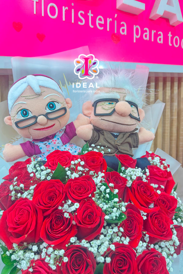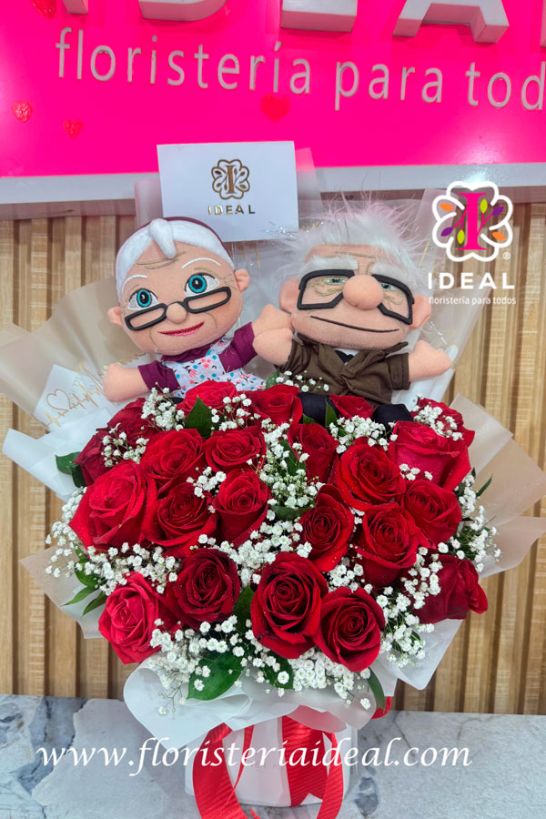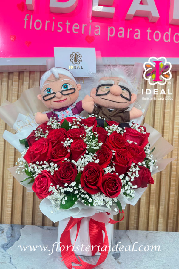 revive ese amor con un regalo asi y que sean hasta viejitos arreglo elaborado en rosa roja acompañado de dos abuelitos