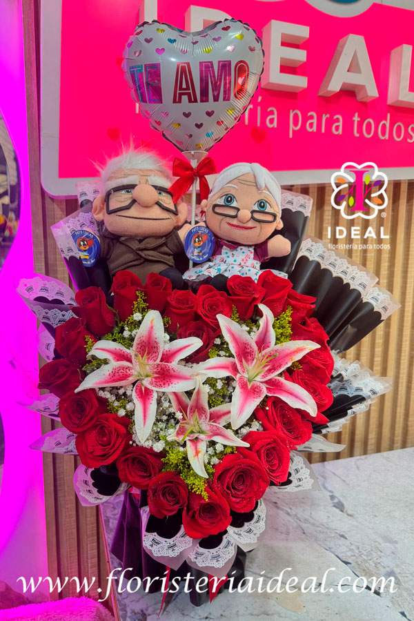 hermoso corazon elaborado en rosa roja acompañado de dos abuelos y unos lirios
