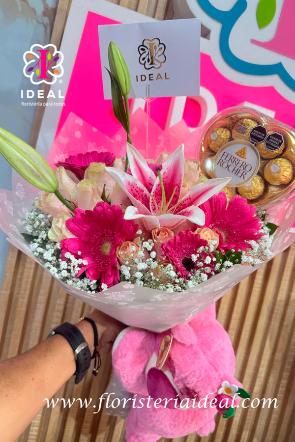 hermoso y delicado en tonos pasteles arreglal floral acompañado del oso dormilon