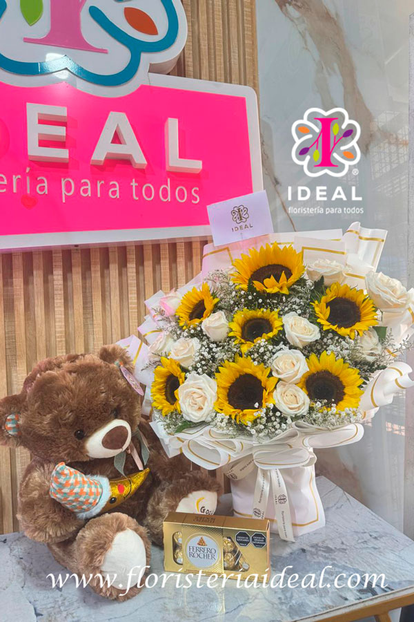 hermoso combo extrahordinario en girasoles acompañado de rosas blancas acompañado de un peluche hermoso