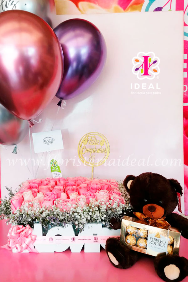 Espectacular arreglo floral elaborado en bellas rosas rosadas acompañado de oso de peluche, chocolate ferrero rocher, globos en helio y tarjeta para la ocasión.