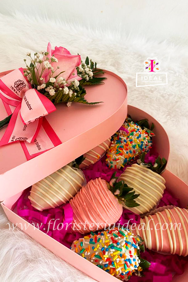 Endulza el día de tu ser querido con esta linda caja en forma corazón acompañada de deliciosas fresas bañadas en chocolates .