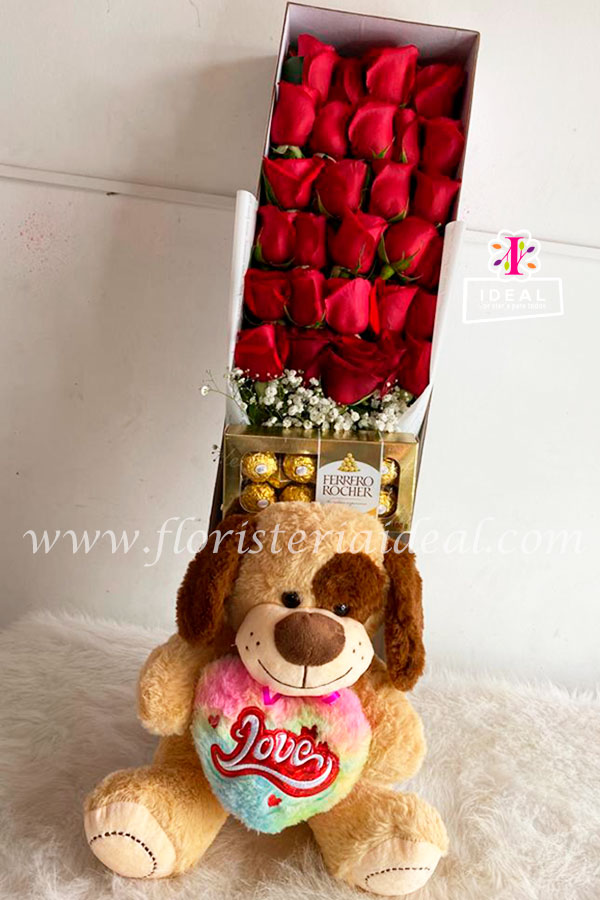 Linda caja alargada elaborada en hermosas rosas rojas acompañada de tierno peluche y deliciosos chocolates Ferreros incluye tarjeta para la ocasión.