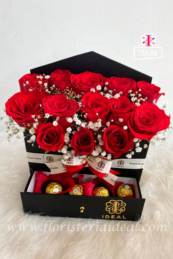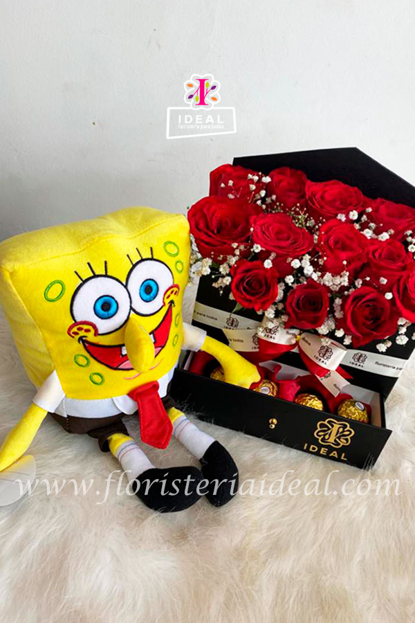 Delicada caja tipo cartera decorada en lindas rosas rojas acompañada de tierno peluche Bob esponja mas chocolates Ferreros y tarjeta para la ocasión.