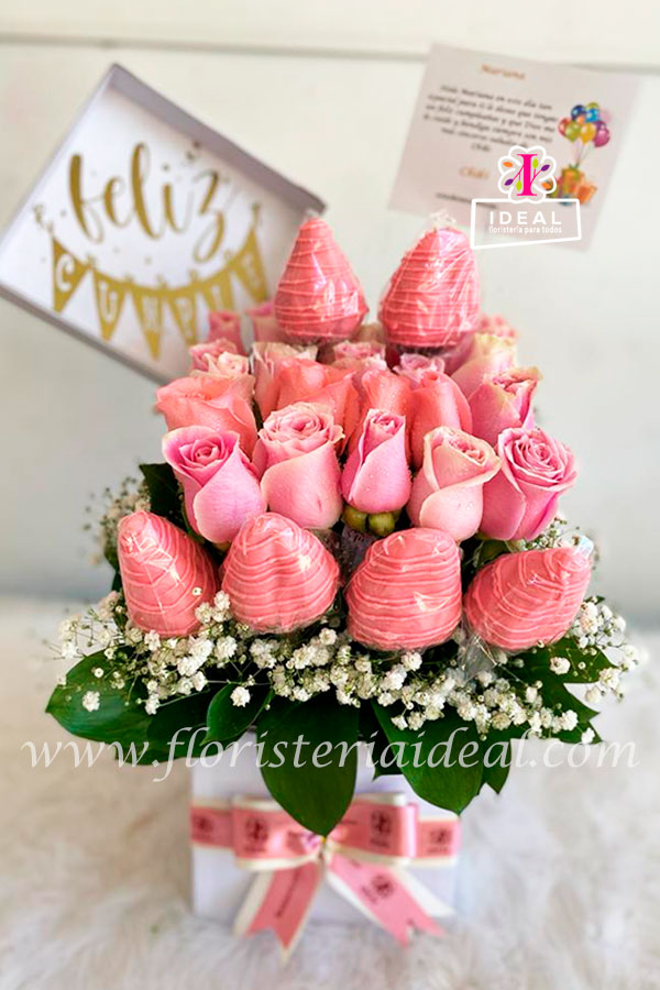 Lindo arreglo floral elaborado en bellas rosas rosadas y follajes verdes incluye fresas en finos chocolate y tarjeta para la ocasión