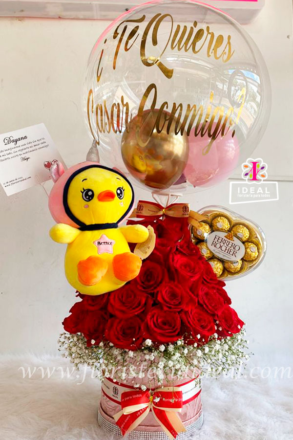 Delicado arreglo floral en forma redonda elaborado en bellas rosas y chocolates Ferreros Rocher en estuche de corazón acompañado de globo y tierno peluche.