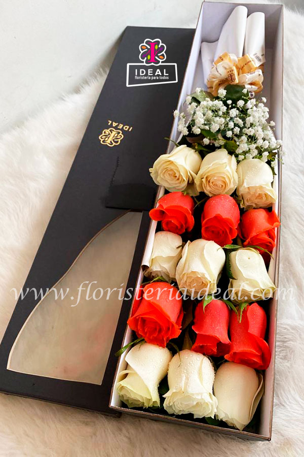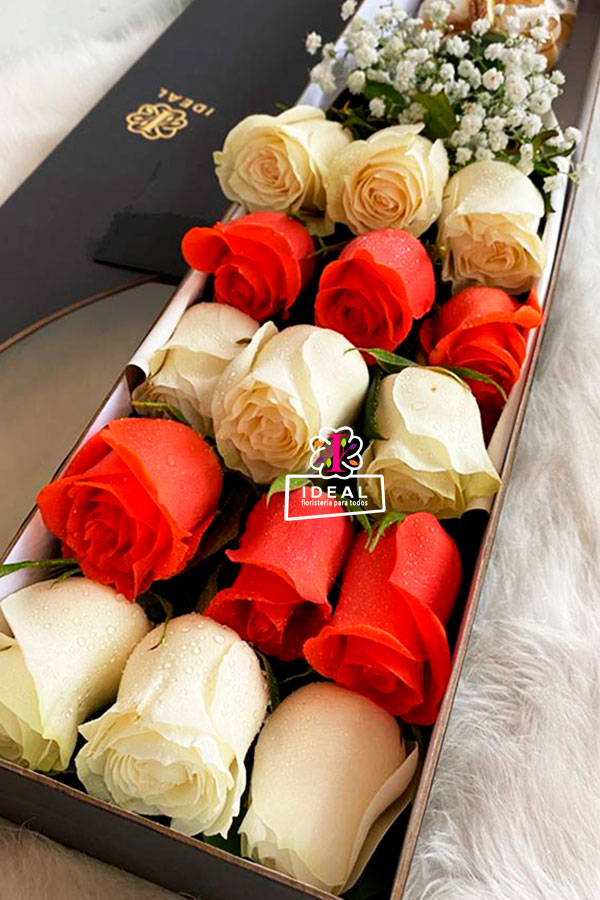 Arreglo floral en delicada caja acompañado bellas rosas y lindos follajes incluye linda tarjeta para la ocasión.