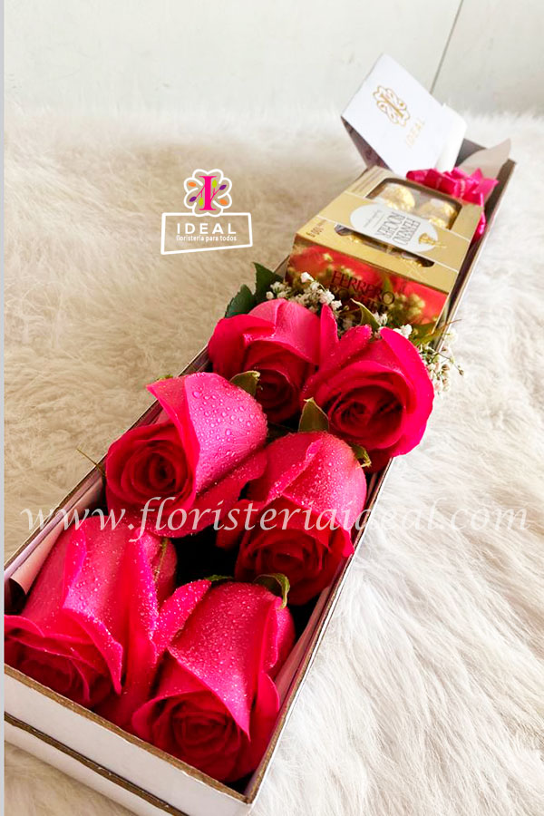 Delicada caja de rosas color fucsia acompañada de estuche Ferrero Rocher incluye tarjeta para la ocasion.