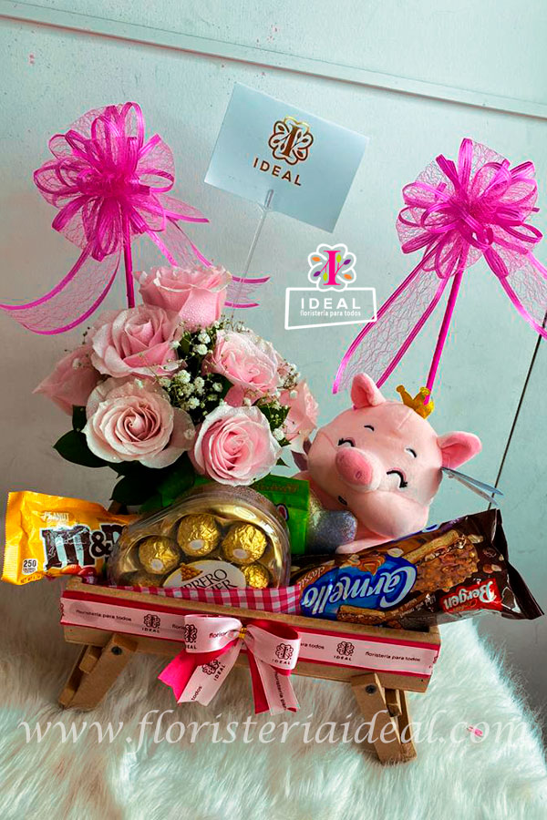 Delicado detalle * Arreglo floral * Chocolates Ferreros en estuche * MyM * Galletas carmello bañadas en chocolates * Gomitas trululu * decoracion y base madera * Lindo peluche