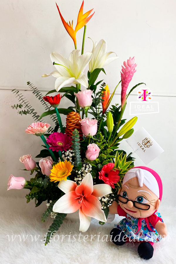 Delicado arreglo floral elaborado con bellas flores surtidas acompañado de lindos follajes y tierno peluche de pelicula up incluye tarjeta para la ocasión.