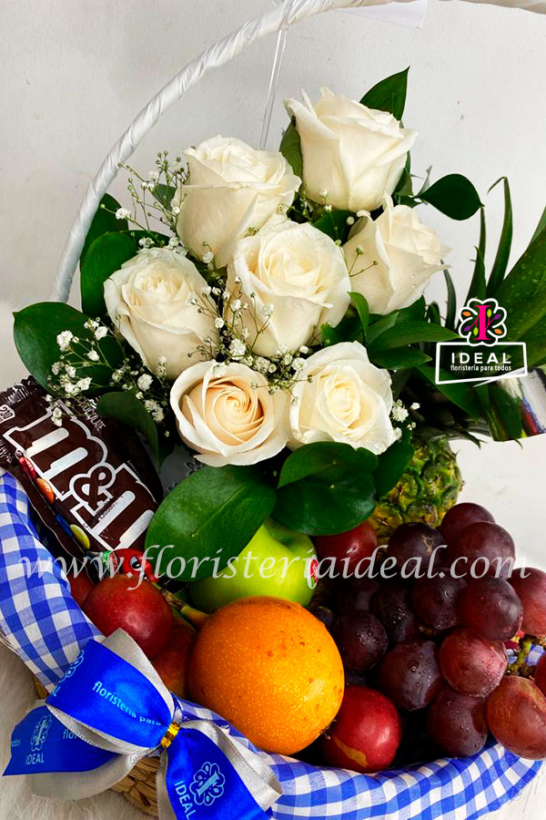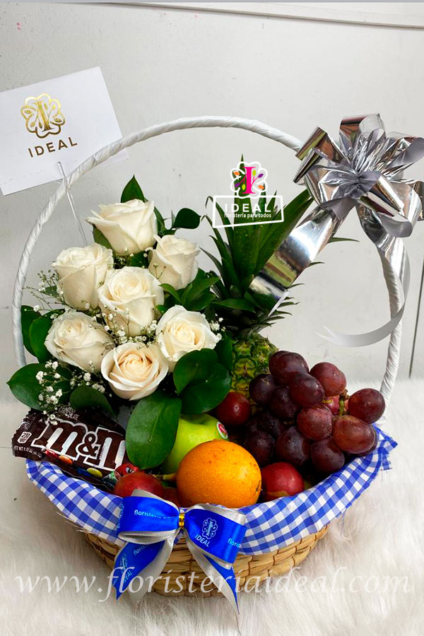 Delicada canasta frutal acompañada de lindas rosas y chocolates