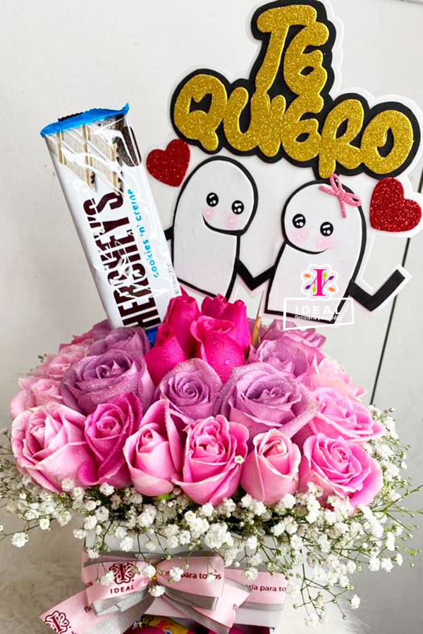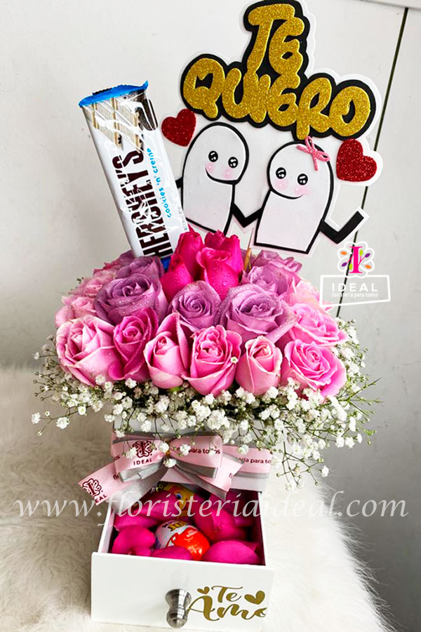 Delicado y muy bello cofre elaborado el tipo madera contiene: hermosas rosas, acompañado chocolates kinder bueno, hersheys, mym mas su respectiva tarjeta con mensaje deseado.
