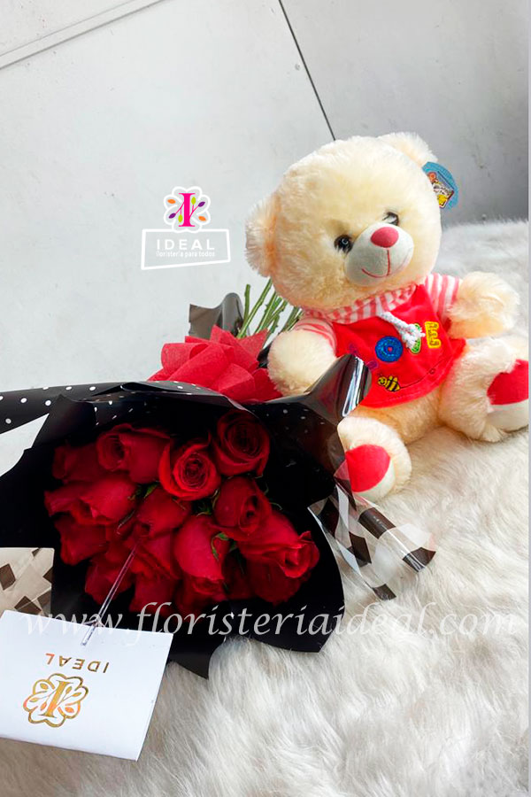 Arreglo floral tipo buquet elaborado en bellas rosas rojas acompañado de tierno peluche incluye tarjeta para la ocasión,.