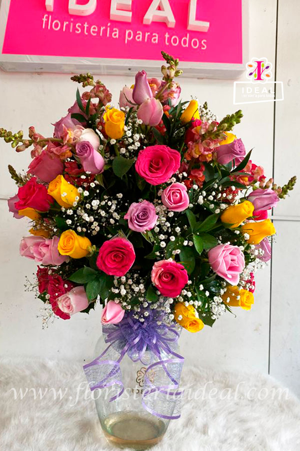 Delicado arreglo floral elaborado en bellas rosas de colores de forma redonda acompañado de lindos follajes verdes incluye jarrón de vidrio tipo samaritano y tarjeta para la ocasion.
