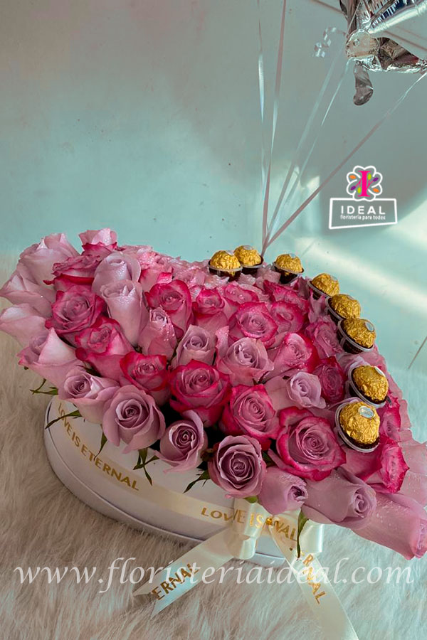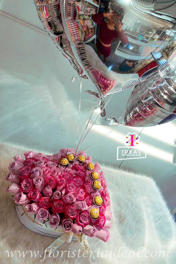 Delicado ramo floral en forma de corazon acompañado de chocolates Ferrero Rocher , moño decorativo ,globos metalizados caja tipo cuerina y tarjeta con mensaje deseado para la tarjeta.