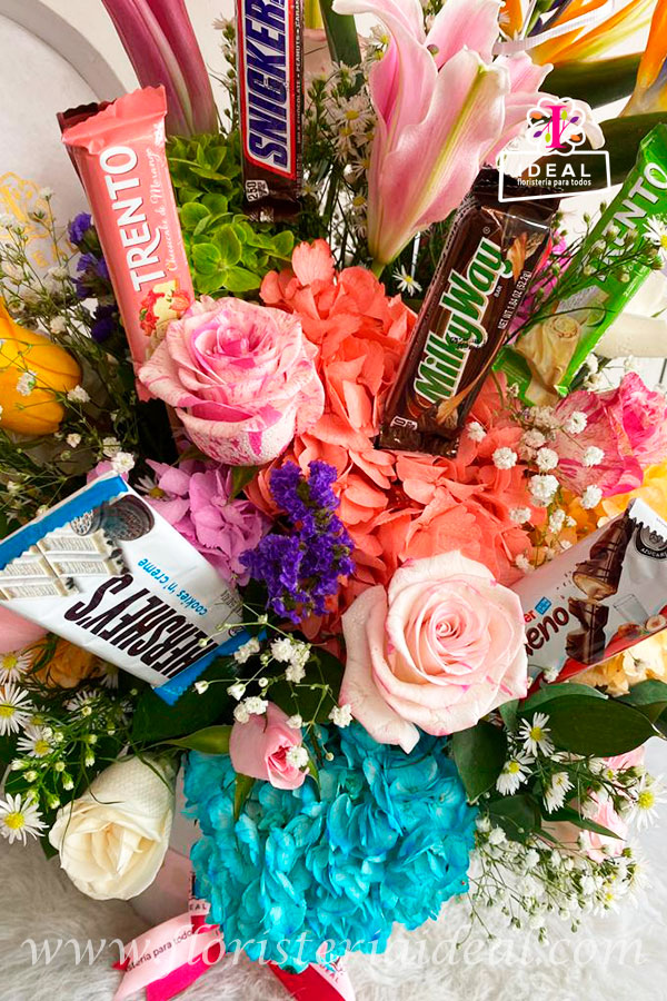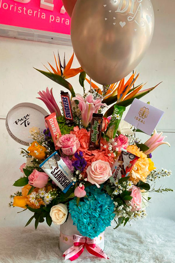 Caja redonda elaborada en rosas blancas, hortensias , delicados follajes verdes , diferentes chocolates surtidos acompañado de tarjeta con mensaje deseado para la ocasión.