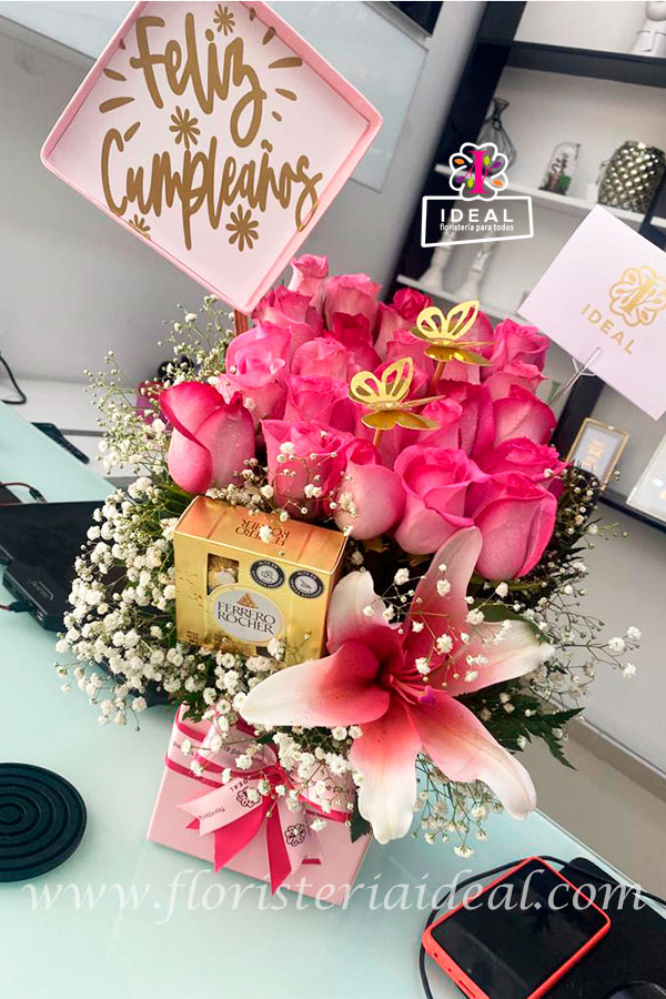 Cajita elaborada en delicadas rosas de tonalidad pastel especial para un lindo detalle acompañada de chocolates ferreros. incluye tarjeta para la ocasión