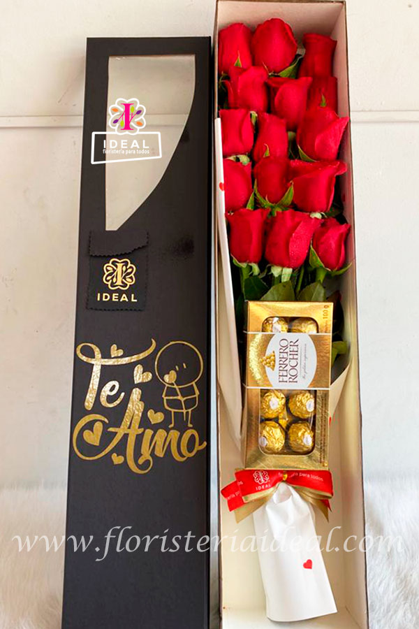 Delicado arreglo floral elaborado en lindas rosas en caja esta acompañado de ricos chocolates ferreros incluye tarjeta para la ocasion.