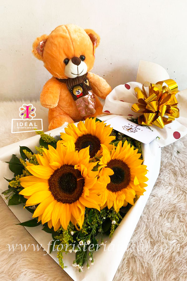 Delicado arreglo floral de girasoles tipo buque acompañado de tierno peluche, y lo acompaña tarjeta para la ocasión.