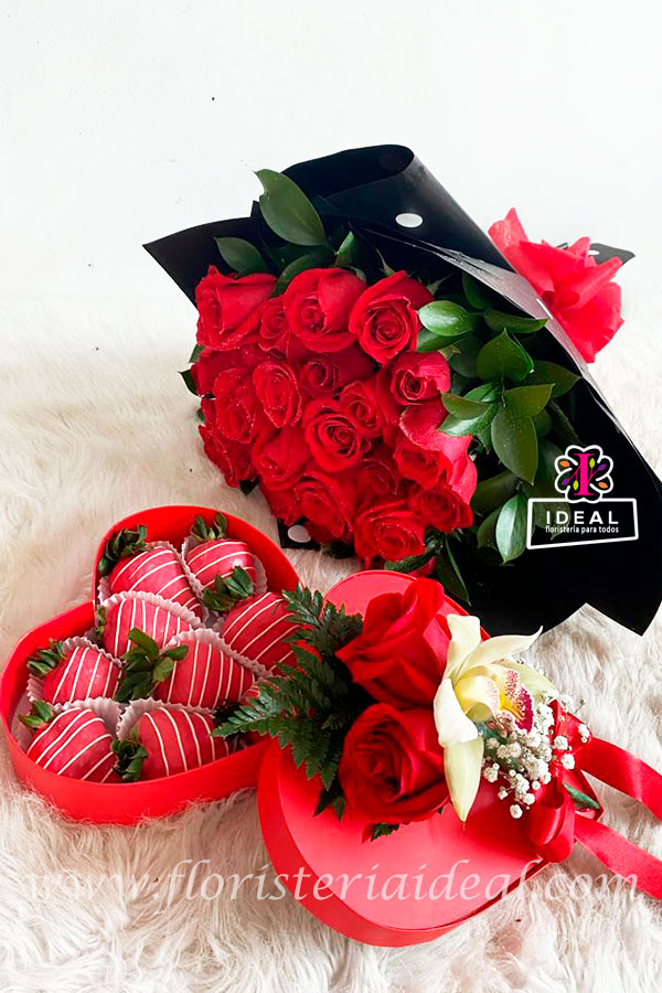 Exprésate con este lindo detalle elaborado en bellas rosas y delicado estuche de choco fresas incluye tarjeta con expresivo mensaje para la ocasión.