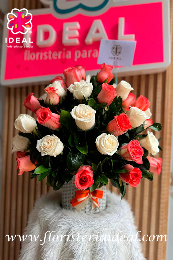 hermoso ramo redondo en una maseta con una variedad de rosas color salmón y blanco con su respectiva tarjeta personalizada