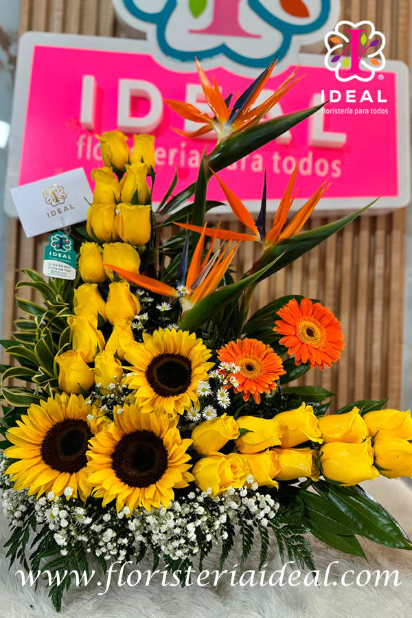hermoso arreglo floral en forma de L elaborado con hermosas rosas amarillas, girasoles, gerveras y unas hermosas aves de paraiso espectaular para regalar