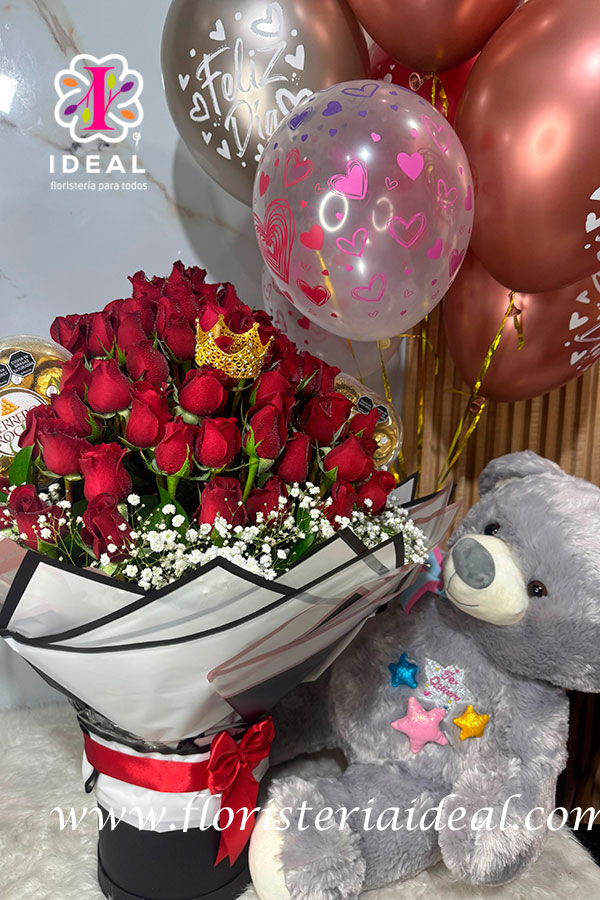 espectacular ramo premium elaborado de rosas rojas con un espectacular peluche y globos