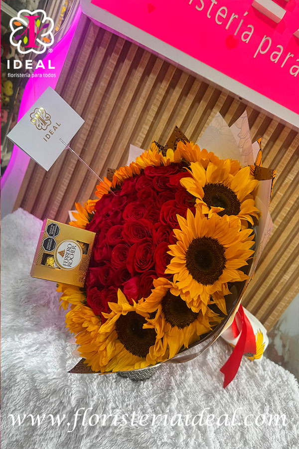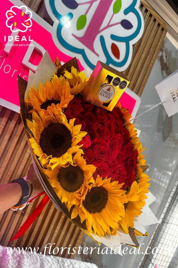 de la mano con girasoles y rosas,hermoso arreglo floral elaborado en rosas rojas y girasoles acompañado de un delicioso chocolate ferrero de 4