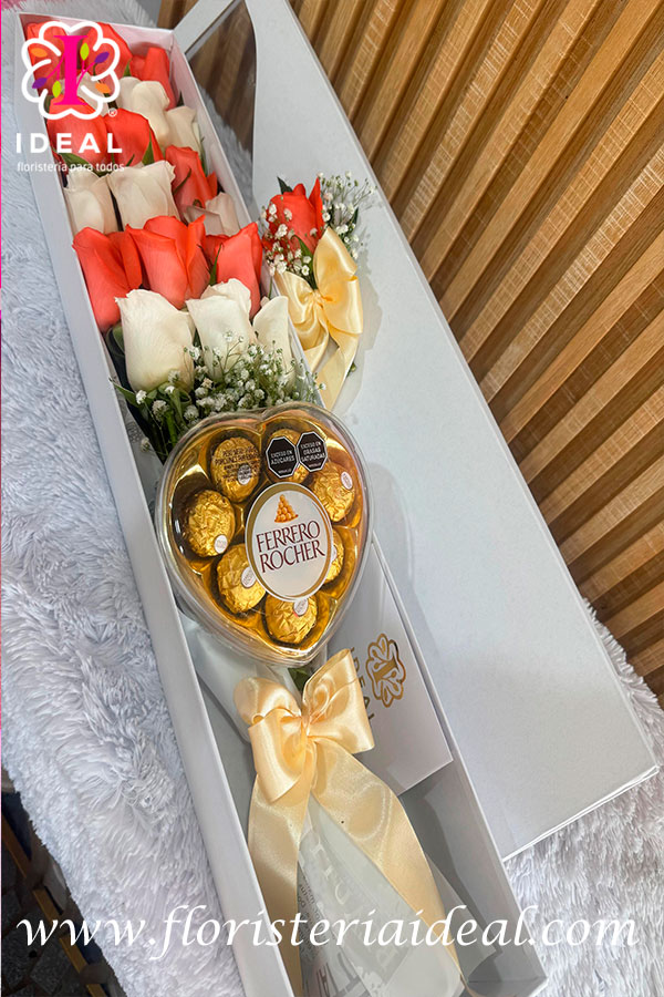 cajita perfecta elaborado en dos tipos de rosas acompañado de un delicioso chocolate