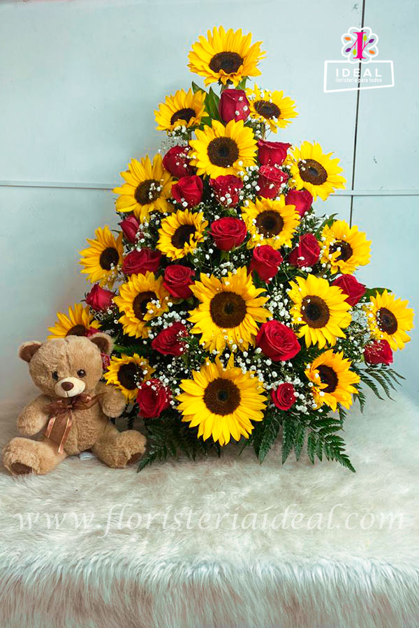 Hermoso ramo floral lindas rosas y girasoles con follajes acompañado de tierno peluche y tarjeta con mensaje deseado para la ocasión .