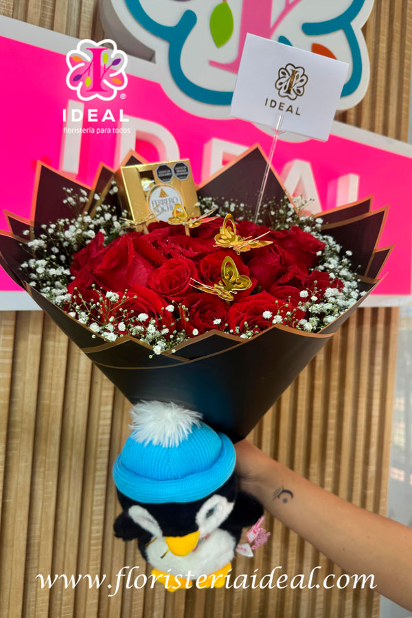 hermoso arreglo floral elaborado en rosa roja acompañado de un hermoso peluche de tu elección
