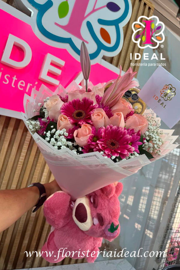 el detalle indicado para sorprender a tu persona ideal, un arreglo floral de mano elaborado en rosas rosadas y variedad acompañado de un hermoso lotso dormilon
