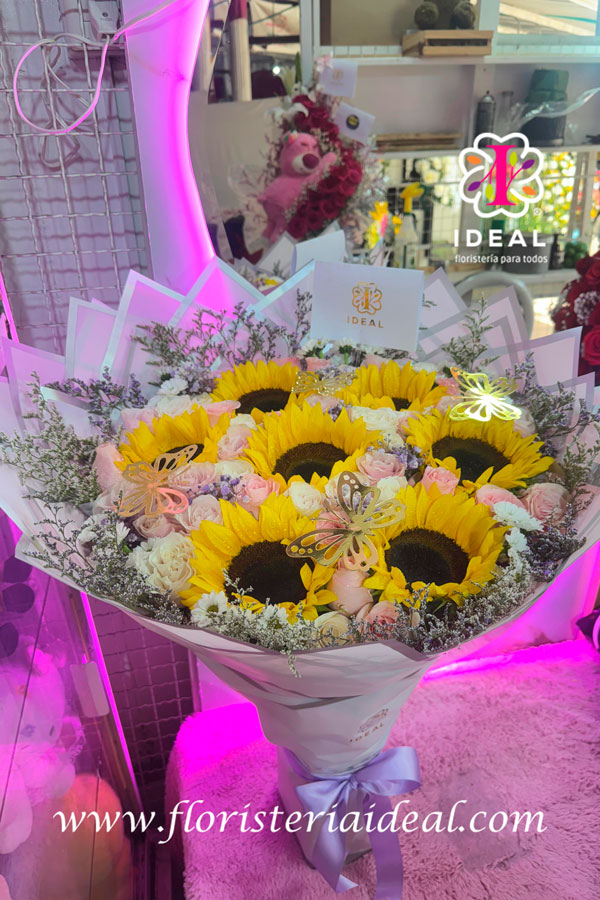 hermoso arreglo premium en girasoles y rosas tonos pasteles