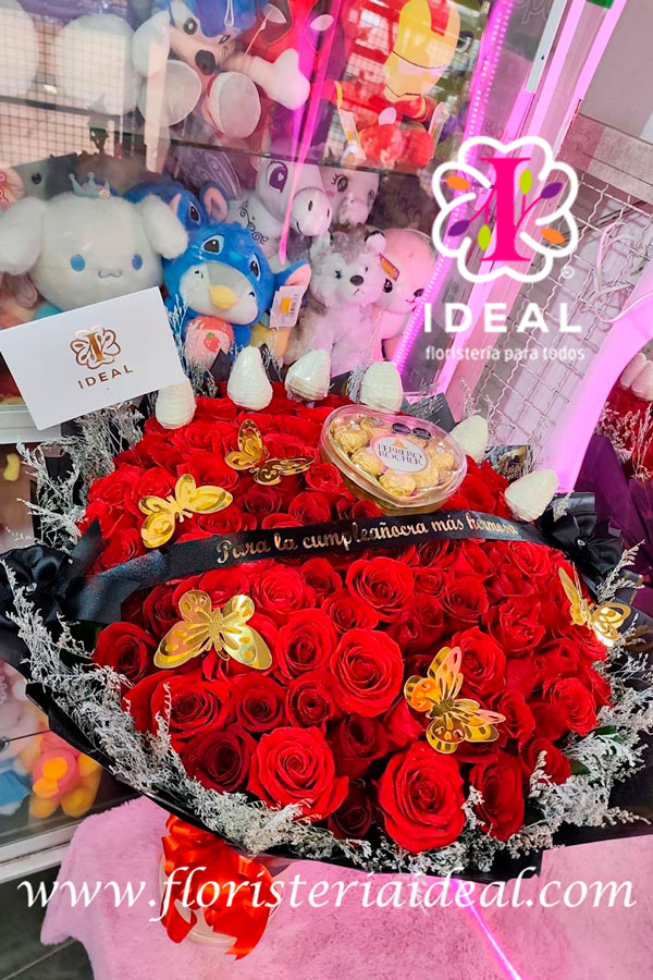 hermoso arreglo floral premium elaborado con 100-120 rosas fresas cubiertas de chocolate y un ferrero de 8