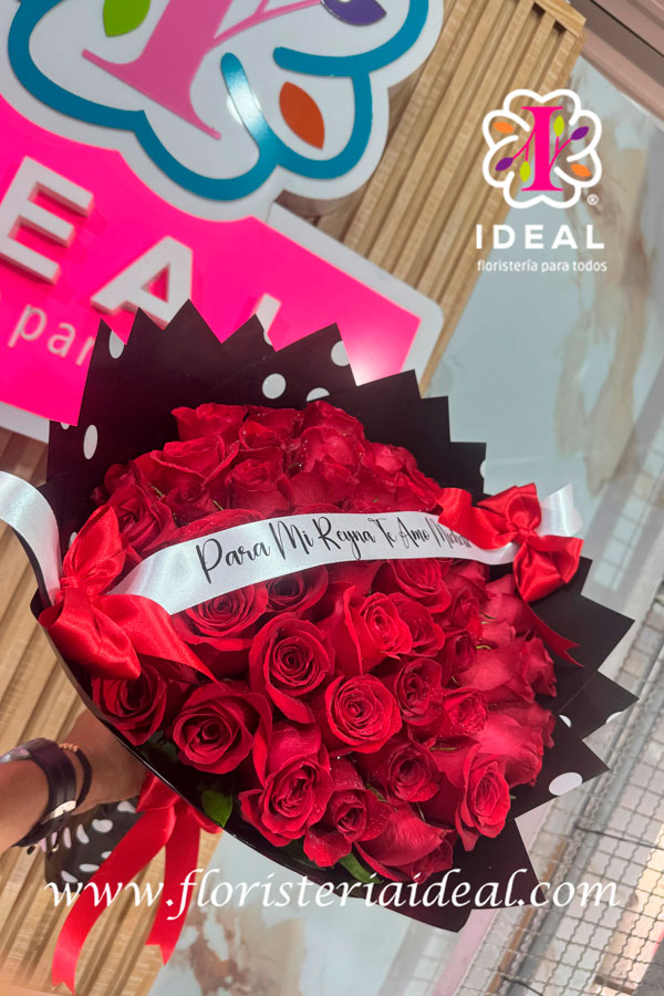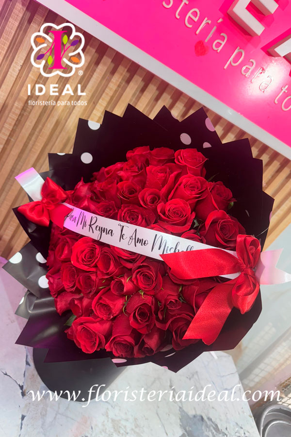 hermoso arreglo floral de mano elaborado en rosas rojas con una cinta
