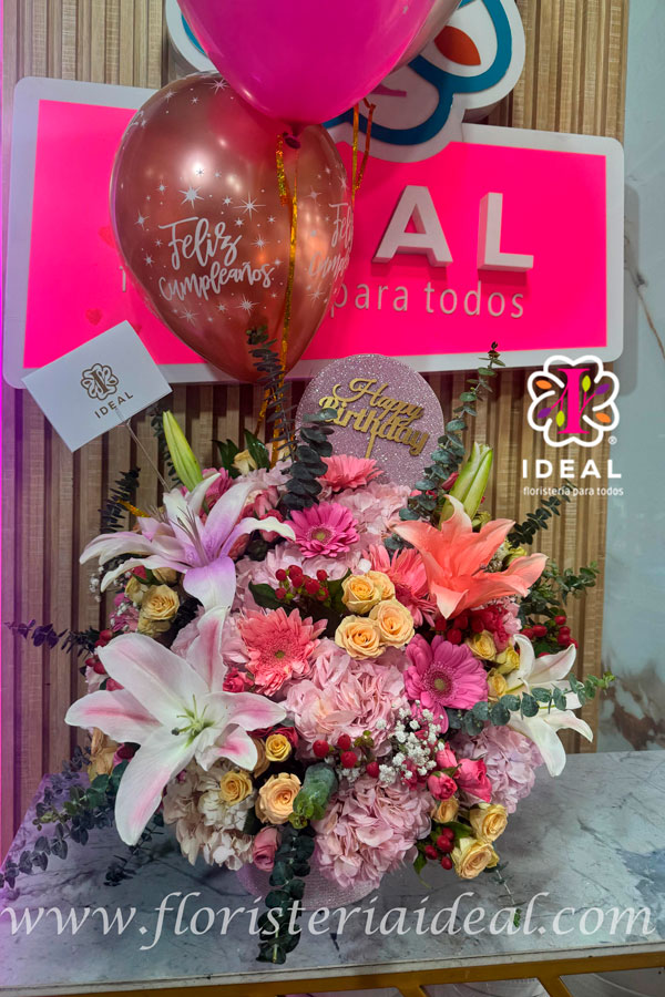 hermoso tropical elaborado en variedad de flores de una cara, acompañado de globos