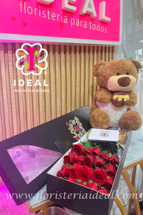 hermosa caja luxury elaborada en rosas rojas con chocolates y con un osito
