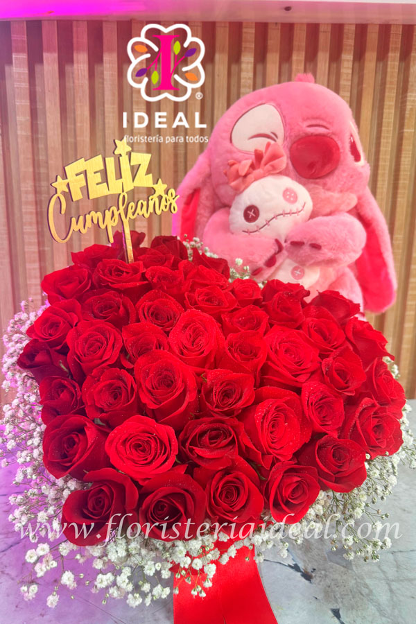 hermoso corazon rojo elaborado en rosa roja acompañado de un hermoso stich rosado con su respectivo toper