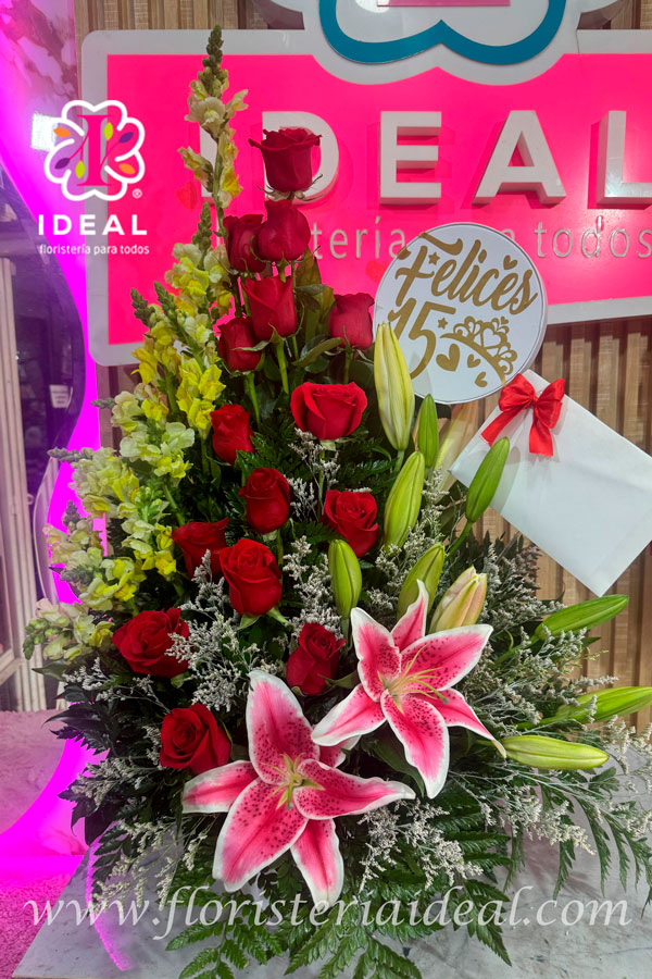 pirámide elaborada en rosas rojas con lirios y follaje, perfecto para cualquier ocasión