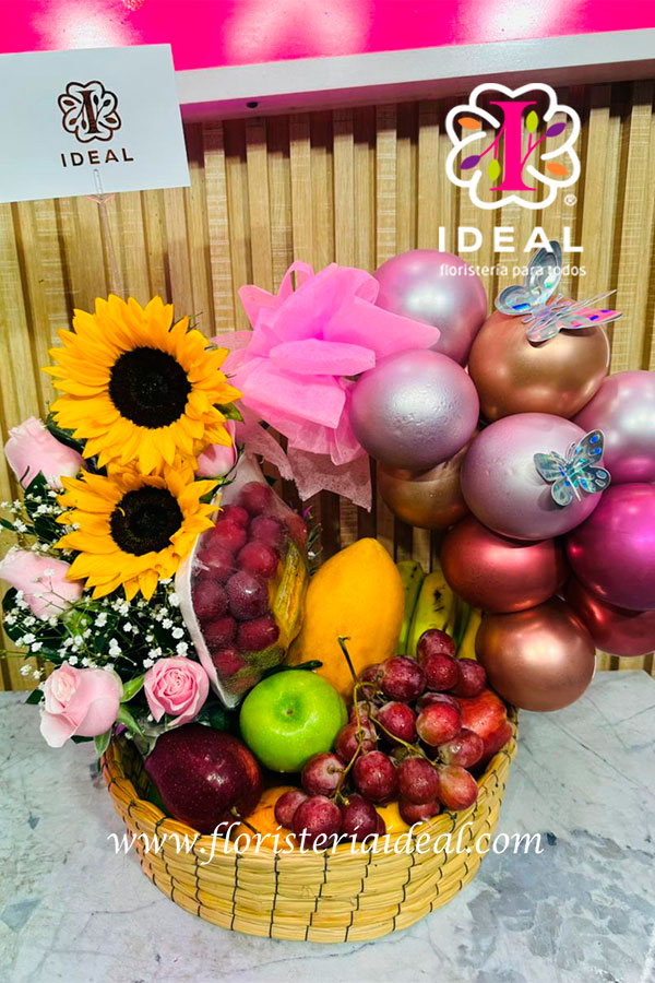Hermoso arreglo en canasta de frutas, con un mini arreglo en rosas y globos. Viene con una gran variedad de frutas, y con una tarjeta personalizada para la ocasión.