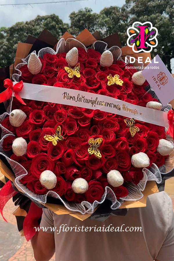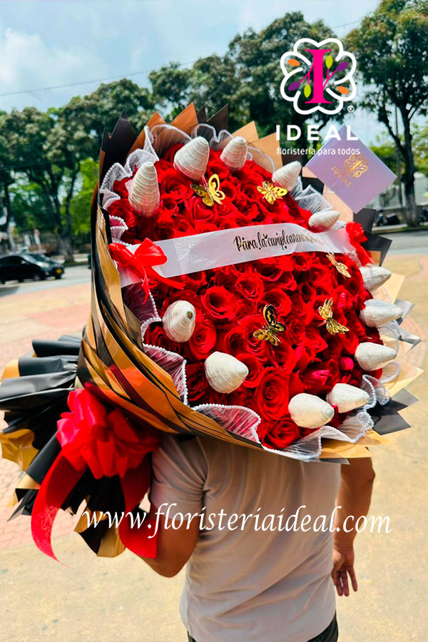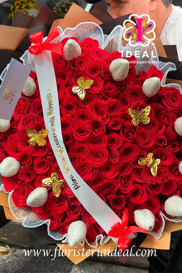 Esta elaborado con una envoltura en papel coreano, tul de perlas, y deliciosas choco fresas, con hermosa cinta personalizada con mensaje, y elegante tarjeta para la ocasión.
