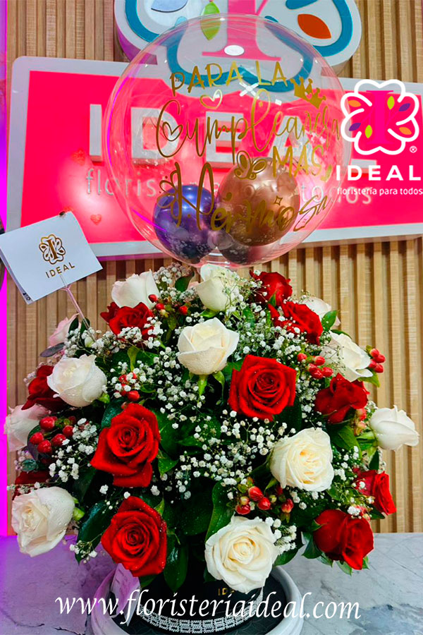 Hermoso arreglo de rosas en base, lo complementan lindos follajes verdes, y un globo en burbuja con un mensaje para la ocasión, también lo acompaña una tarjeta personalizada.