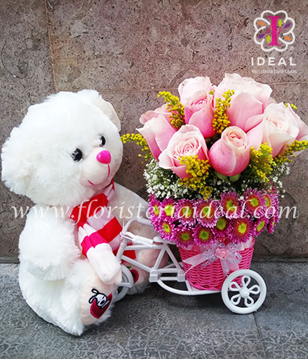 acompaña la llegada es tu hermoso bebe con este tierna bicicleta acompañada de lindas rosas y hermosas coquetas incluye tierno osito de peluche y tarjeta con mensaje para esta ocasion.